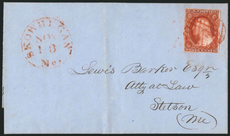 1425 c Image3c Orange Brown, Ty. I (10). Full to clear margins, brilliant color, tied by complementary red grid cancels, matching "Skowhegan Me. Nov. 18 (1851)" circular datestamp on folded letter to Stetson Me., central fold fold well clear of stamp, Extremely Fine (Image)