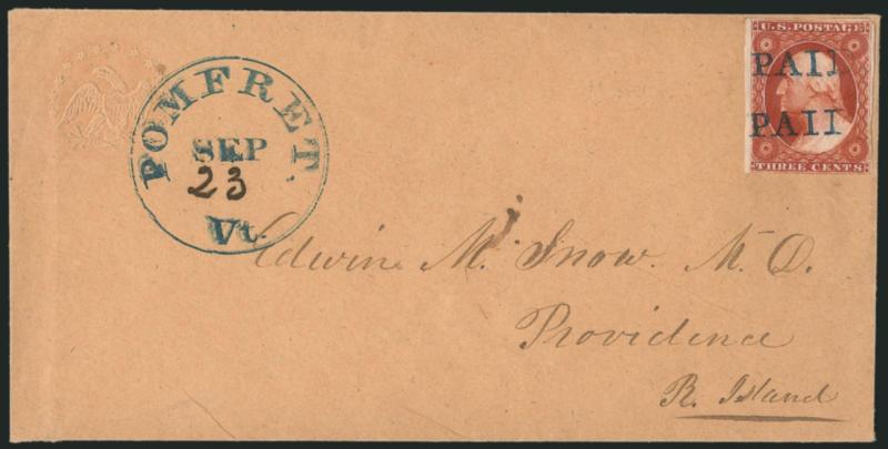 1426 c Image3c Orange Brown, Ty. I (10). Large margins to just clear at bottom right, vivid color, cancelled by two bold strikes of blue "PAID" handstamp, matching "Pomfret Vt. Sep. 23" circular datestamp with date in ms. on blind embossed 13 star, eagle and shield corner card cover to Providence R.I., Extremely Fine, a beautiful and striking cover (Image)