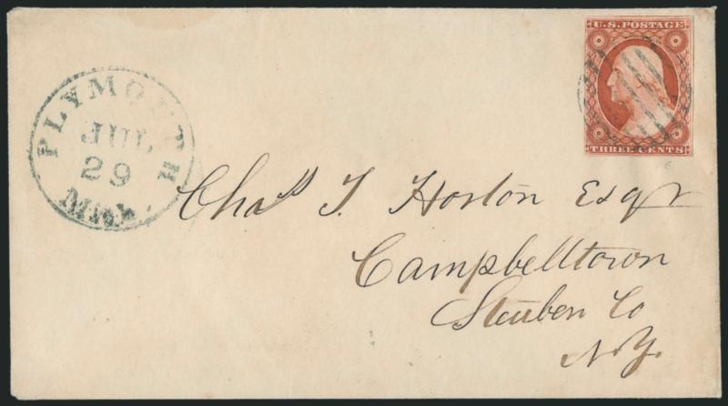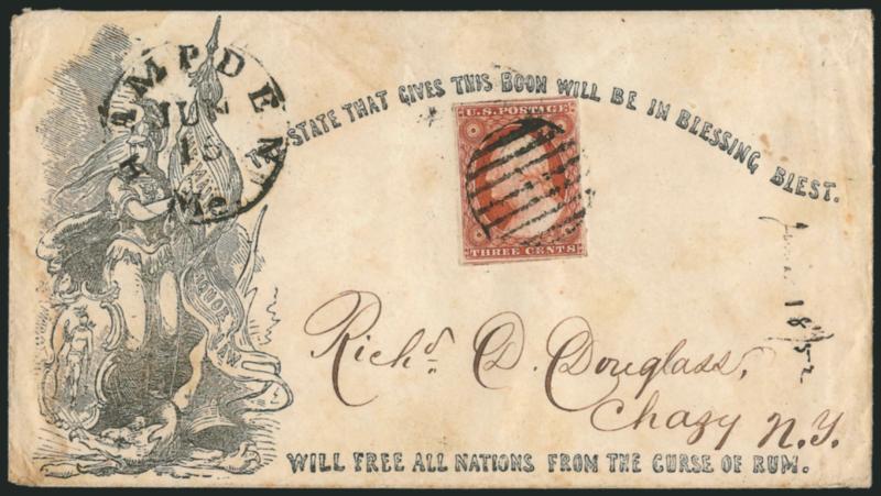 1428 c Image3c Orange Brown, Ty. II (10A). Large to clear margins, rich color, tied by circular grid with matching "Hampden Me. Jun. 15" circular datestamp on Maine Liquor Law Temperance cover, docketed at right, cover with areas of light staining, still Very Fine, a similar example from our 2009 Jarrett sale franked with a 3c No. 11A realized $3,000, with 2009 P.F. certificate (Image)