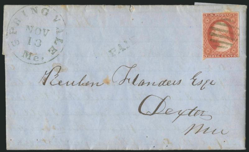 1429 c Image3c Orange Brown, Ty. II (10A). Position 12R2E, full margins to barely in at bottom right, cancelled by green grid with matching "Springvale Me. Nov. 13 (1851)" circular datestamp and "Paid" straightline on folded letter to Dexter Me., small cover tear at top, otherwise Very Fine, with 2009 P.F. certificate (Image)