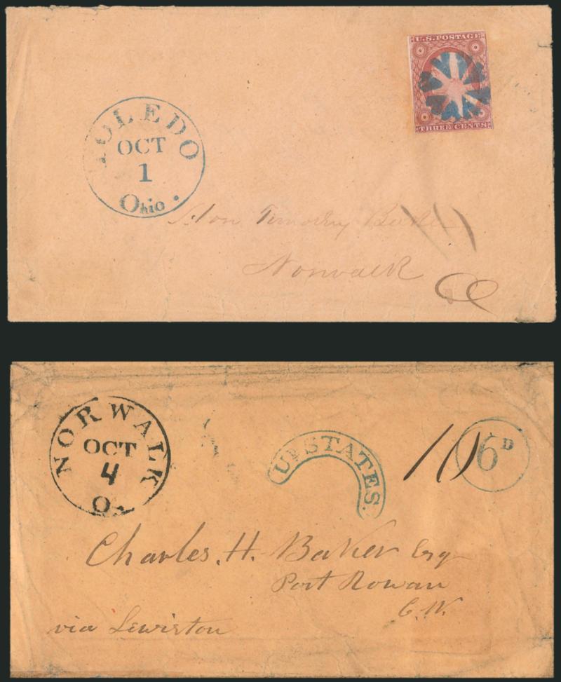 1430 c Image3c Orange Brown, Ty. II (10A). Clear margins to barely touched at upper right, rich color, neat blue Circle of Hearts fancy cancel with matching "Toledo Ohio Oct. 1 (1851)" circular datestamp on turned cover to Norwalk O., second use with "Norwalk O. Oct. 4" circular datestamp, ms. "10" rate for treaty rate to Port Rowan, Canada West, blue "Ud. States" in arc handstamp, matching "6d" due handstamp, endorsed "via Lewiston" at bottom though exchanged at Buffalo, transit and receiving backstamps, some cover wear and couple minor backflap tears, still Very Fine, a spectacular turned cover with the Toledo fancy cancel and the 1851 3c Orange Brown, rare with the combination of domestic and cross-border use (Image)