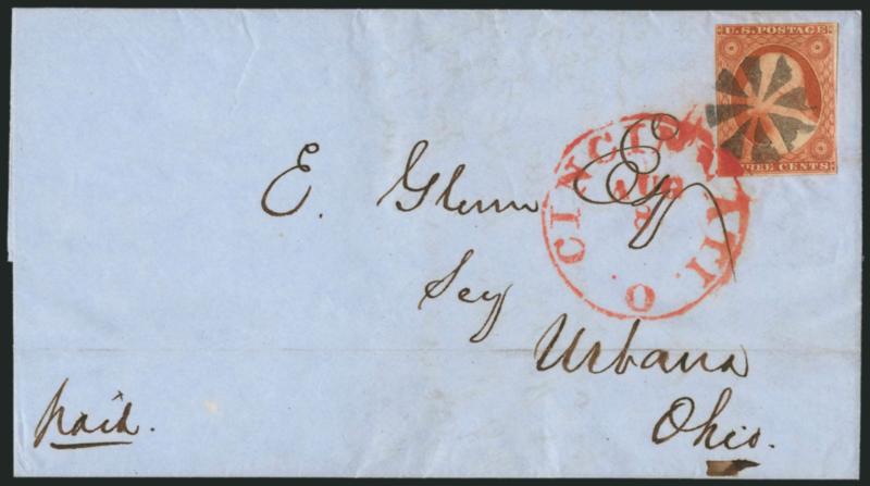 1431 c Image3c Orange Brown, Ty. II (10A). Brilliant color, ample to clear margins, tied by circle of wedges cancel and paint red "Cincinnati O. Aug. 8 (1851)" circular datestamp on pre-printed "Mechanics and Traders Branch Bank, Cincinnati" folded letter to Urbana O., Extremely Fine, ex Alexander, Cole and White (Image)