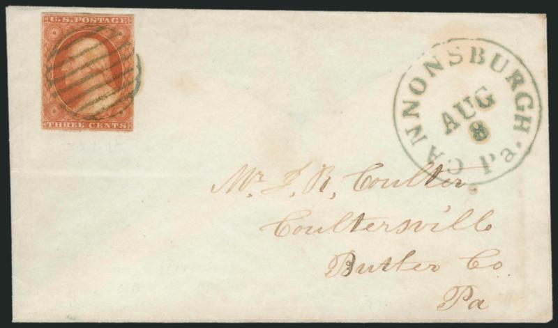 1432 c Image3c Yellowish Orange Brown, Ty. II (10A var). Position 32L1E, tight but clear margins, vivid color, tied by bluish-green "Cannonsburgh Pa. Aug. 8" (1851) circular datestamp on cover to Coultersville Pa., Extremely Fine, a scarce shade on or off-cover, Wilson Hulme recorded fewer than 70 examples, Hulme's initials on back (Image)