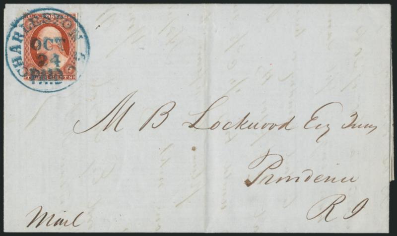 1433 c Image3c Orange Brown, Ty. II (10A). Position 3R0, bright color, full to clear margins, tied by bold strike of blue "Charleston S.C. Paid Oct. 24" (1851) circular datestamp on folded letter and prices current to Providence R.I., file fold does not affect stamp, Extremely Fine, initialed by Wilson Hulme as "Experimental O.B." but plated by Richard Celler as Plate 0 (Orange Brown plate), if Hulme was correct this is an unusual shade from a No. 10/10A plate, the 1851 Experimental Orange Brown is known to come from Plate 1L, ex Makepeace (Image)