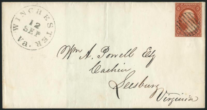 1434 c Image3c Orange Brown, Ty. II (10A). Position 23L2E, deep rich color, full to clear margins all around incl. trace of adjoining stamp at right, cancelled by neat circular grid with matching "Winchester Va. 12 Sep." (1851) circular datestamp on folded cover to Leesburg Va., Extremely Fine, a fresh and pretty cover (Image)