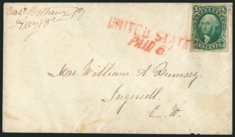 1478 c Image10c Green, Ty. II, III (14, 15). Three covers, No. 15 with large to clear margins, pen-cancelled and tied by red "United States Paid 6d" two-line handstamp on cover to Ingersoll, Canada West, top flap tears, otherwise Very Fine, other two franked with No. 14 from California to East Coast, one with huge to ample margins, other slightly cut in at right, some cover faults, appear Fine-Very Fine (Image)