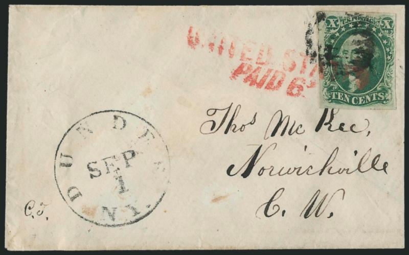 1479 c Image10c Green, Ty. III (15). Large margins to clear, tied by black grid cancel, matching "Dundee N.Y. Sep. 1" circular datestamp on small cover to Norwichville, Canada West, stamp also tied by red "United States Paid 6d" two-line handstamp, receiving backstamp, Very Fine (Image)