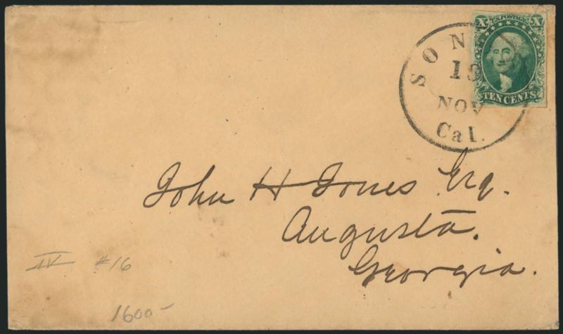 1480 c Image10c Green, Ty. IV (16). Position 64L1, recut at both top and bottom, large margins to just touched at top right, tied by neat "Sonora Cal. Nov. 19" circular datestamp on cover to Augusta Ga., slight cover soiling, still Very Fine, ex Judd (Image)
