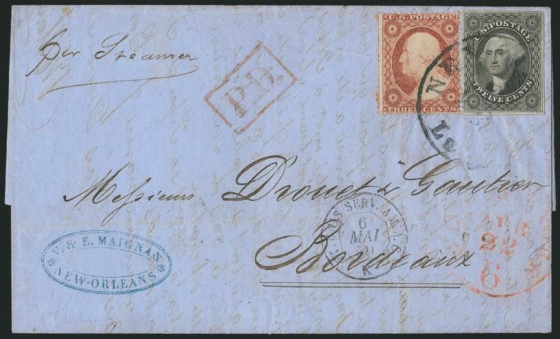 1481 c Image12c Black (17). Large margins to full, used with 3c Rose, Ty. I (25) and tied by "New Orleans La." circular datestamp on blue 1859 folded letter to Bordeaux, France, red "New York Paid 6 Apr. 22" credit datestamp, appropriate transits, light horizontal file fold well clear of stamps, Very Fine, an exceedingly scarce combination use, carried aboard the Vanderbilt Line's Vanderbilt (Image)