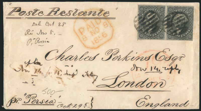 1482 c Image12c Black (17). Horizontal pair, full margins to just in, tied by grids, red "New York 19 Oct. 2?" integral-rate circular datestamp on cover to Charles Perkins in London, England, 1856 London transit, some wear, Very Fine (Image)