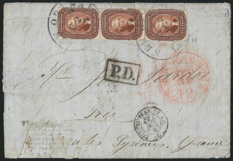 1506 c Image5c Red Brown (28). Vertical strip of three, rich color in the same shade as the imperforate issue, perfs scissors-separated at right leaving intact perfs, tied by strikes of "New Orleans La. Sep. 22, 1857" circular datestamp on blue folded prices current to Trie, France, red "New York Paid 12 Sep. 30" credit datestamp, boxed "P.D." handstamp, transit and receiving datestamps, few perf faults middle stamp, cover with some wear incl. splits and eroded spot at bottom, appears Fine, scarce use, this September 1857 cover pre-dates the March 1858 Red Brown printing (the shade is the 1856 No. 12 shade), Scott Retail for used strip of three off cover (Image)