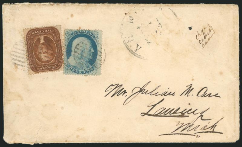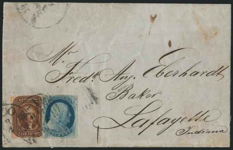 1511 c Image5c Brown, Ty. II (30A). Used with slightly overlapping 1c Blue, Ty. V (24), stamps tied by grid cancels and "New York Mar. 14, 1861" circular datestamp on folded letter to Lafayette Ind., 5c stamp few short perfs at left, still Very Fine, a rarely-seen combination to pay double the 3c domestic rate, ex Rohloff, with 1980 P.F. certificate, also incl. single No. 9, huge margins to touching at bottom, Very Fine (Image)