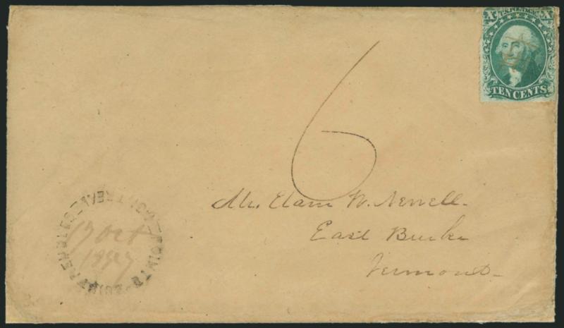 1513 c Image10c Green, Ty. II (32). Stamp defective, cancelled by penstrokes on cover originating in Canada and sent to Vt., Montreal rimless handstamp with "17 Oct. 1857" date in ms., "6" due marking, top flap reattached and expertly repaired along edges, still appears Fine, scarce use, with 1983 P.F. certificate (Image)