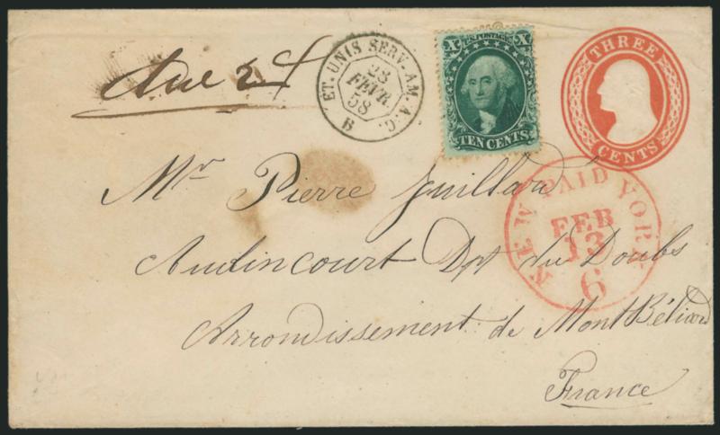 1514 c Image10c Green, Ty. II (32). Uncancelled but "tied" by some toning around perfs on 3c Red Nesbitt entire to France, red "New York Paid 6 Feb. 13" credit datestamp, 1858 French transit, ms. "Due 2c", cover with central toned spot, appears Very Fine, unusual use as most short-paid covers were treated as completely unpaid (Image)