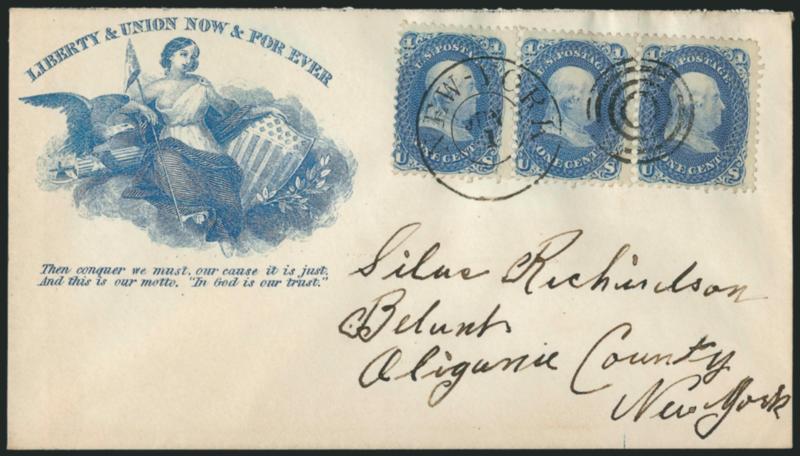 1520 c Image1c Blue (63). Horizontal strip of three, deep rich color, tied by target cancel and duplex "New-York Jun. 1" double-circle datestamp on blue "Liberty & Union Now & Forever" Patriotic to Belunt N.Y., fresh and Very Fine, a beautiful cover (Image)
