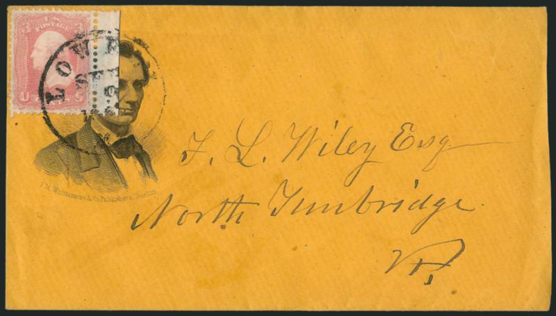 1521 c Image3c Pink (64). Vivid color, beautifully balanced margins with selvage at right, tied by "Lowell Ms. Sep. 9, 1861" circular datestamp on cover to North Tunbridge Vt. with beardless Lincoln three-quarter portrait in oval, Milgram AL-13, J.M. Whittemore & Co. imprint, stamp tied partly overlapping portrait, barely reduced at right, fresh and Extremely Fine, a gorgeous Lincoln cover with a choice example of the 1861 3c Pink (Image)