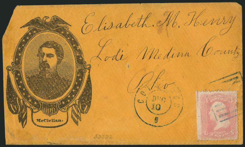 1522 c Image3c Pink (64). Gorgeous color, natural s.e. at left, tied by blue boxed grid, matching "Columbus O. Dec. 10" double-circle datestamp on McClellan Patriotic cover to Lodi O., reduced at left, stamp and cover with tiny toned spot at right, still Very Fine (Image)