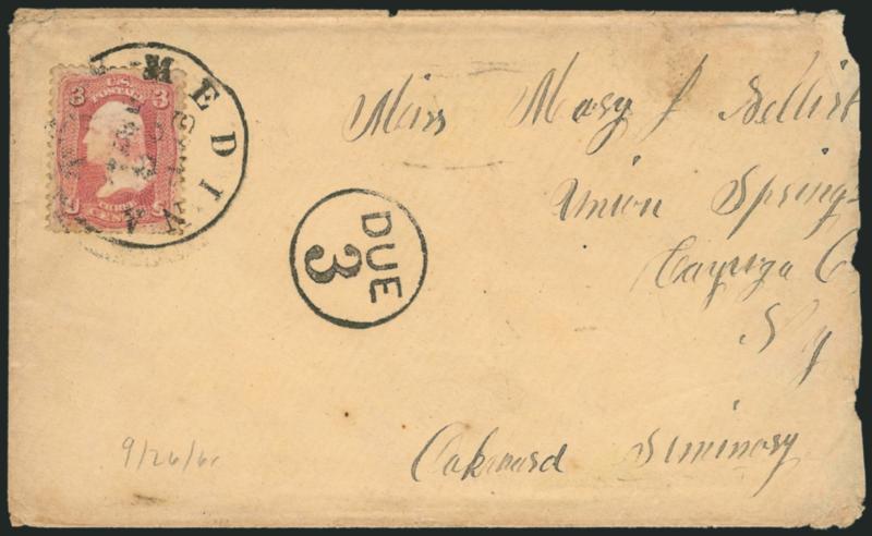 1524 c Image3c Pigeon Blood Pink (64a). Bright shade, tied by "Medina N.Y. Sept. 26, 1861" circular datestamp on cover to Union Springs N.Y., bold "Due 3" in circle handstamp, opened a bit unevenly at right and minor edgewear, few short or pulled perfs at bottom, otherwise Very Fine example of this desirable shade, ex Hulme, with 2009 P.F. certificate (Image)