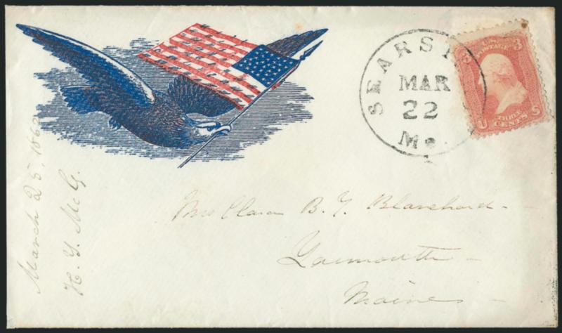 1526 c Image3c Rose Pink (64b). Bright shade, tied by "Searsmont Me. Mar. 22 (1862)" circular datestamp on red and blue Union patriotic cover to Yarmouth Me. depicting an eagle in flight holding an American flag, original contents a lengthy letter written partly in two directions, stamp with pulled perf at top and small corner stain, otherwise Very Fine, attractive better shade on patriotic cover, with 2009 P.F. certificate (Image)