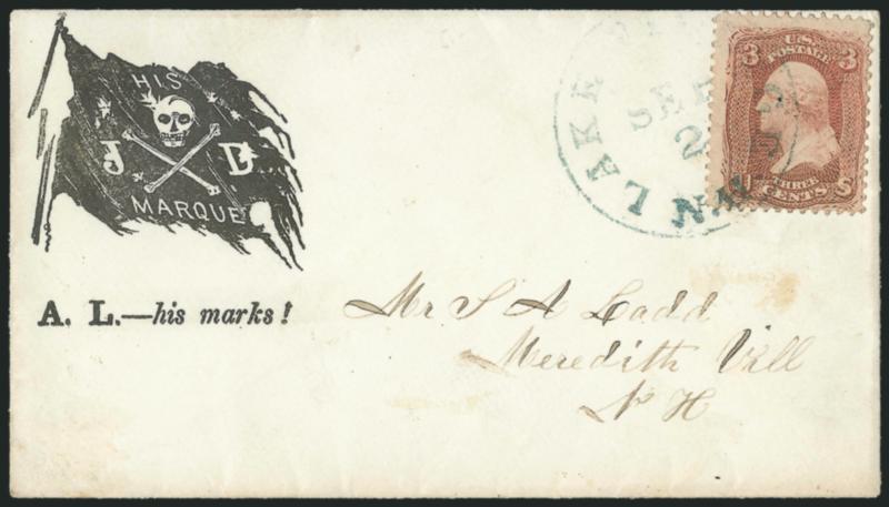 1531 c Image3c Rose (65). Color slightly oxidized, tied by "Lake Village N.H. Sep. 2" circular datestamp on cover to Meredith Hill N.H. with "J. D. His Marque" and "A.L. -- his marks!" pirate flag Union patriotic design, minor top flap tear, Very Fine, a scarce and desirable Patriotic design referring to Jefferson Davis and Abraham Lincoln, ex Walcott (Image)
