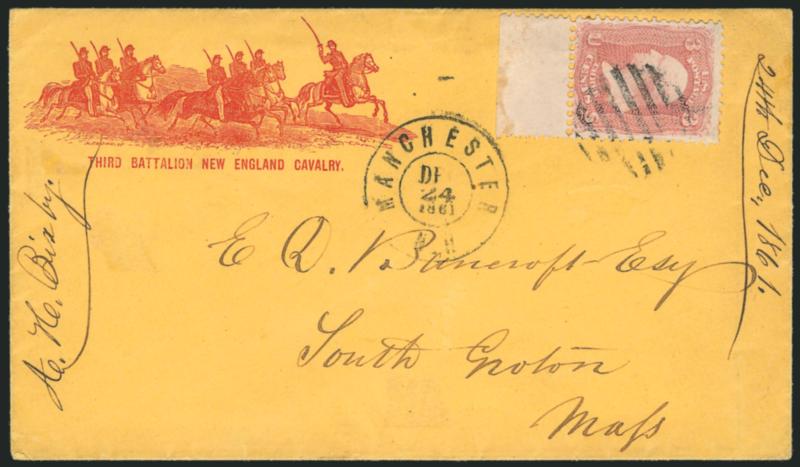 1532 c Image3c Rose (65). Sheet selvage at bottom, bright color, tied by grid cancel, matching "Manchester N.H. Dec. 24, 1861" double-circle datestamp on yellow cover to South Groton Mass., with red illustrated "Third Battalion New England Cavalry" patriotic design, enclosed letter with same illustration, Very Fine, beautiful Union cavalry design mailed Christmas eve (Image)