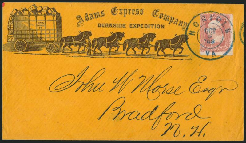1534 c Image3c Rose (65) Inter-pane margin at right, tied by bold "Norfolk Va. Oct. 6 '63" double-circle datestamp on Adams Express Co., Burnside Expedition orange illustrated cover with four horses pulling a large wagon, to Bradford N.H., Nesbitt & Co. imprint on back, Very Fine, a beautiful design, with 1997 P.F. certificate (Image)