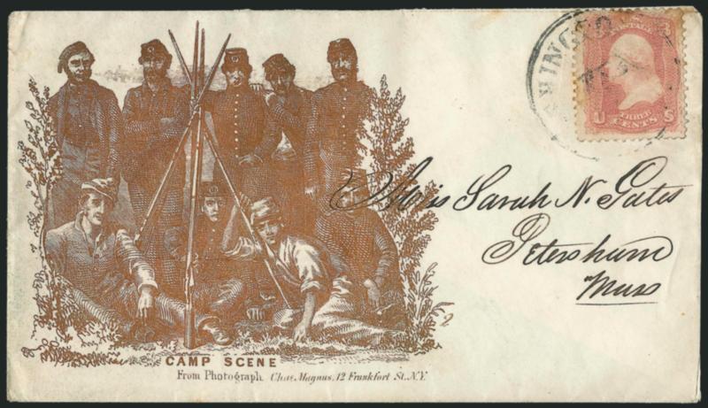 1535 c Image3c Rose (65). Tied by indistinct strike of Washington D.C. circular datestamp on cover to Petersham Mass. with bronze Magnus "Camp Scene From Photograph" design, stamp with tear and areas of toning, still appears Very Fine, a beautiful patriotic design, also incl. second multicolored Magnus design depicting lady and shield at top left, franked with 3c Rose, reduced at lower right and small cover tear, appears Fine (Image)