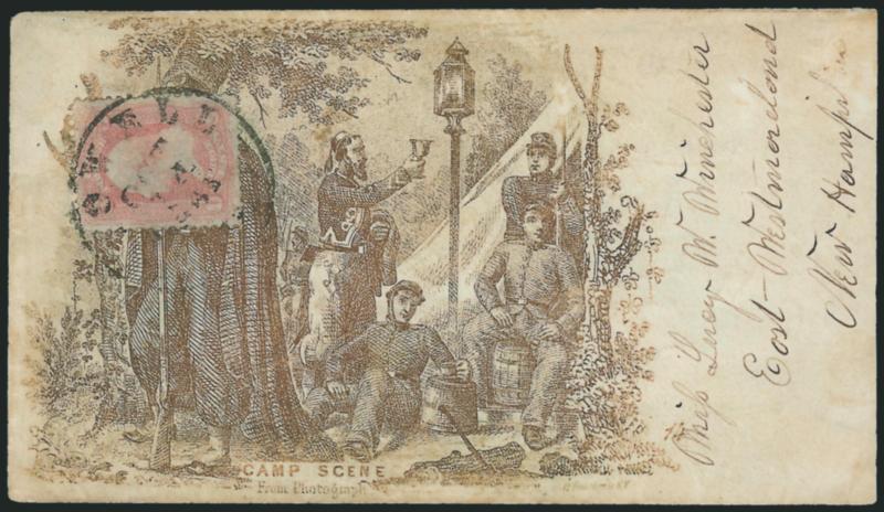 1536 c Image3c Rose (65). Tied by "Lowell Ms. Oct. 14, 1861" circular datestamp on cover to East Westmoreland N.H. with bronze Magnus "Camp Scene From Photograph" patriotic design, barely reduced at right, minor soiling, Very Fine and rare, ex Jarrett (Image)