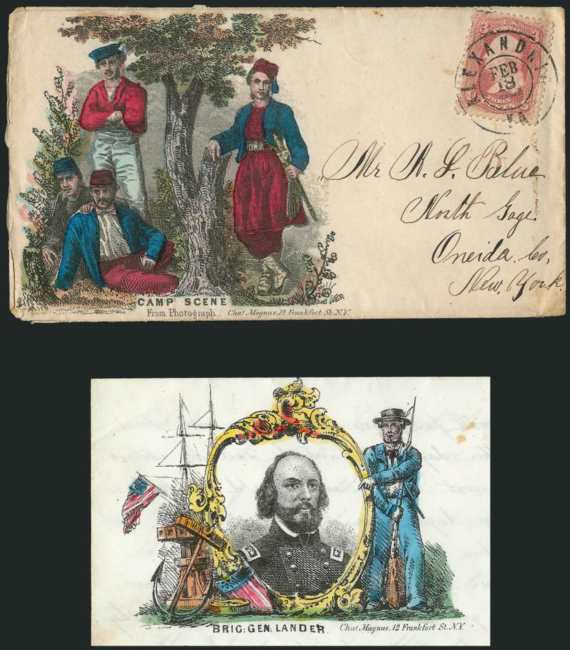 1537 c Image3c Rose (65). Tied by "Alexandria Va. Feb. 18" double-circle datestamp on 1862 multicolored Magnus "Camp Scene from Photograph" patriotic cover to North Gage N.Y., with original Magnus multicolored lettersheet enclosure depicting Brig. Gen. Lander and 4pp detailed letter from a soldier, datelined "Sumner's Division, Camp California, Feb. 17th 1862", relating to part of his regiment being sent down the Mississippi on gun boats, camp life including references to daily deaths in his brigade, religion, and a glowing testimonial to his commanding general for being a man of god, stating "Under such a leader who would not be willing to be led on the field of battle or anywhere that he might purpose to lead them. Would they not be sure of victory, knowing that this leader is one who puts his trust in the God of battles?", stamp with folded perf tip at left, cover with couple rough edges at bottom left and missing part of top flap, still Very Fine, a desirable and beautiful Magnus cover and lettersheet with interesting soldier content (Image)