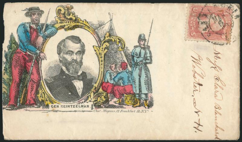 1538 c Image3c Rose (65). Tied by light strike of "Alexandria Va." double-circle datestamp on cover to Webster N.H. with Magnus multicolored Gen. Heintzelman Patriotic design, framed portrait surrounded by soldiers, opened on three sides and slightly reduced at left, still Very Fine (Image)