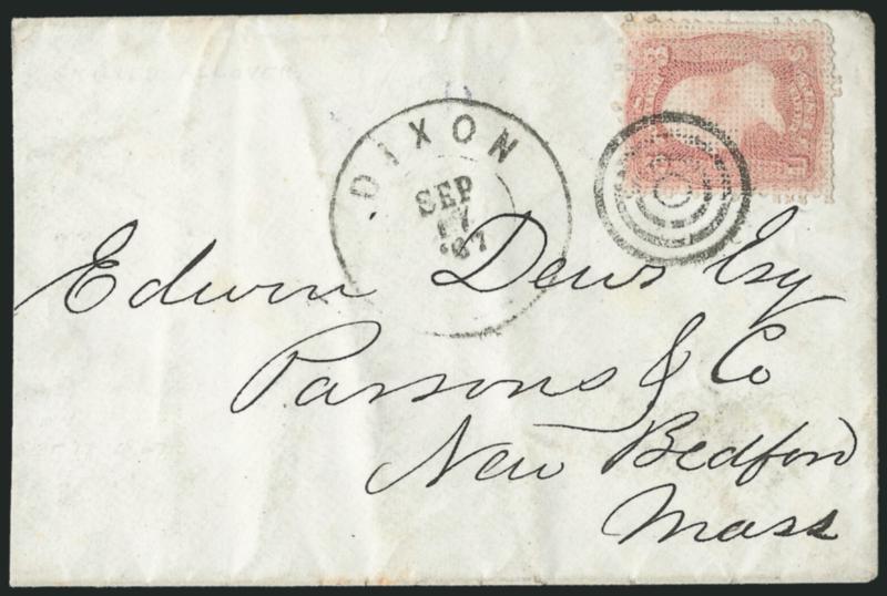 1555 c Image3c Rose, A. Grill (79). Perfs largely intact, tied by neat strike of small target cancel, "Dixon Sep. 17 '67" circular datestamp with unclear state name on cover to New Bedford Mass., part strike of receiving backstamp, stamp with small tear at top, cover reduced at left, appears Very Fine (Image)