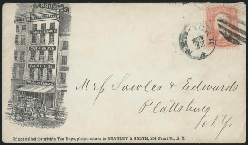 1556 c Image3c Rose, C. Grill (83). Clearly-defined grill, few short perfs at bottom not mentioned on accompanying certificate, tied by large grid and by "New-York Nov. 22" circular datestamp on Warehouse illustrated corner card cover to Plattsburg N.Y., missing small part of top flap, Fine, scarce and attractive use of the 3c C Grill, with 1991 P.F. certificate (Image)