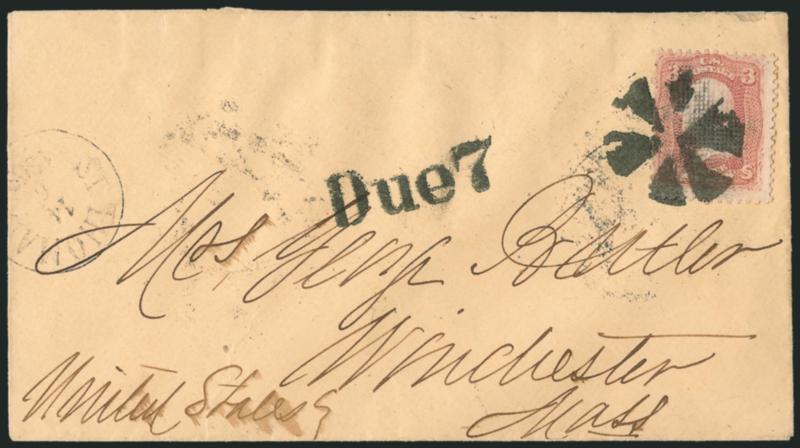 1558 c Image3c Rose, D. Grill (85). Clearly-defined grill, tied by bold strike of large circle of wedges on cover originating in St. Thomas D.W.I. and addressed to Winchester Mass., neat "St. Thomas 14/6 1868" circular datestamp, bold "Due 7" handstamp, back of cover with blue "Forwarded by G.W. Smith & Co., St. Thomas W.I." oval handstamp and "New-York Jun. 20" datestamp, carried on the Merrimack, Very Fine, scarce, this may be the only use of the 3c D Grill from St. Thomas (Image)