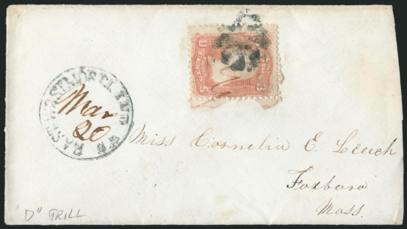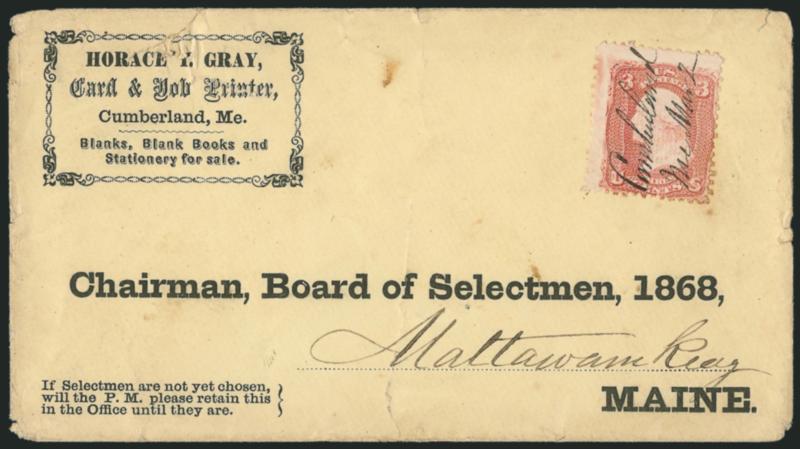 1563 c Image3c Rose, E. Grill (88). Centered to bottom right, ms "Cumberland Me. Mar. 2" manuscript cancel written from the top to the bottom margins but entirely within the stamp, on "Horace I. Gray Card & Job Printer" corner card cover to the Chairman of the Board of Selectmen of Mattawamkeig Me., tears at top and bottom of cover incl. one into the corner card, appears Fine, the Cumberland press-printed postmarks are discussed by Sterling T. Dow in Maine Postal History and Postmarks and by James W. Milgram in an article in the Chronicle (May 2005, pp. 90-95), while this example lacks the printed postmark, Milgram stated his belief that the ms. cancel on this cover is a precancel which was applied to each stamp in the sheet prior to use, the "d" in "Cumberland" does appear to extend off the stamp, though no trace of it appears on the cover, whether or not this use represents a true precancel it is an interesting cover and an excellent companion to one of the press-printed Cumberland datestamp covers, illustrated in Chronicle No. 206, p. 95, with 2009 P.F. certificate (Image)