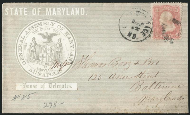 1560 c Image3c Rose, D. Grill (85). Two, first bright color, perf flaw at right, tied by cork, indistinct strike of "Havre de Grace Md. Nov. 14" circular datestamp on State of Maryland Patriotic cover to Baltimore, slightly reduced at right, Fine, second with clear grill, tied by target, "Lowell Mass. Apr. 6" circular datestamp on cover to Boston, stamp lifted to confirm the grill and hinged in place, some edge tears, otherwise Fine (Image)