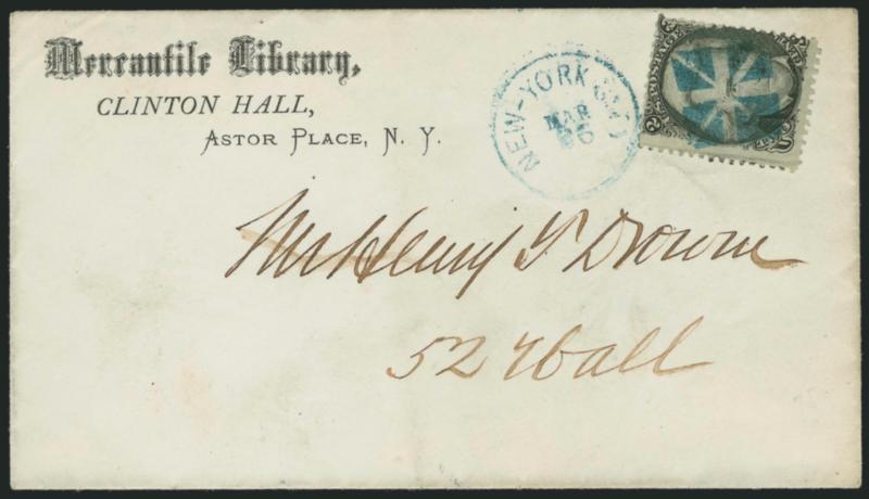 1561 c Image2c Black, Z. Grill (85B). Cancelled by blue geometric fancy cancel and tied by matching "New York City Mar. 26" circular datestamp on Mercantile Library corner card cover to local address, stamp defective at top right probably from separating, otherwise Fine, with 2004 P.F. certificate (Image)