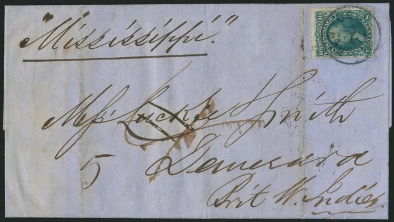 1565 c Image10c Green, E. Grill (89). Clear grill points, s.e. at left, tied by "New York Dec. 23" circular datestamp on blue 1868 folded letter to Demerara, British Guiana, endorsed "Mississippi" at upper left and carried aboard that vessel to St. Thomas and thence by Royal Mail Steam Packet Co. to destination, "St. Thomas De 30 68" backstamp, ms. "4" due marking crossed out and uprated to "5" to include local delivery charge, vertical file folds do not affect stamp, Fine and scarce use (Image)
