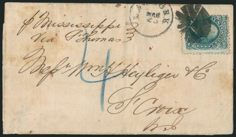 1566 c Image10c Green, E. Grill (89). Bright color, clearly-defined grill, tied by bold cork, "New York Mar. 23" circular datestamp on 1868 folded cover to St. Croix, Danish West Indies, endorsed "p Mississippi via St. Thamos", neat "Forwarded by A. Baiz & Co., N.Y. Mar. 23, 1868", St. Thomas and Frederickstad backstamps, blue crayon "4" due marking, some splitting along folds and some soiling, otherwise Fine (Image)