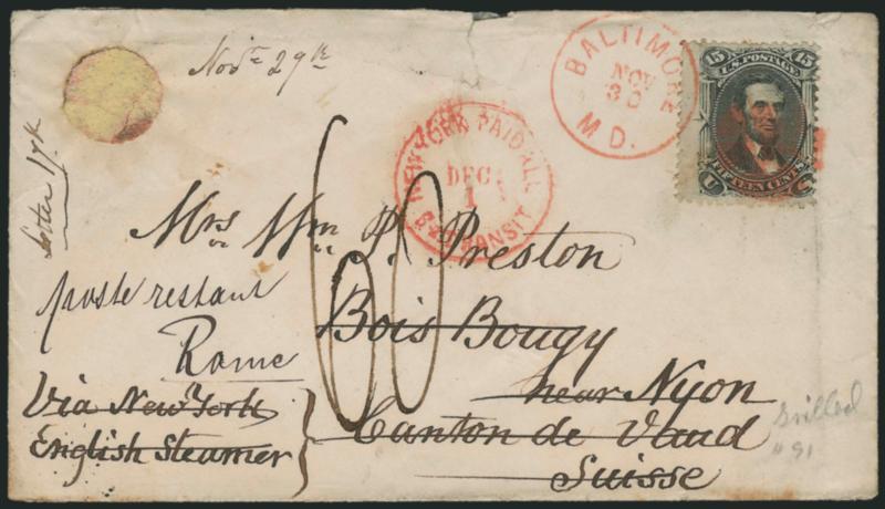 1567 c Image15c Black, E. Grill (91). Deep shade, tied by red cork cancel and matching "Baltimore Md. Nov. 30" circular datestamp on 1868 cover to Switzerland and forwarded to Rome, Italy, red "New York Paid All Br. Transit Dec. 1" circular datestamp, ms. "60" due marking, with original enclosure, adhesive remnant at top left probably where forwarding slip was attached, cover edgewear and tears, still Fine (Image)