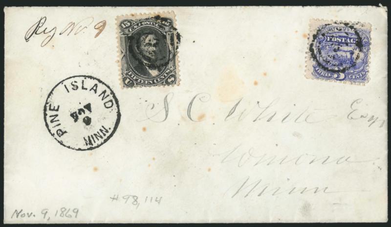 1571 c Image15c Black, F. Grill (98). Used with 3c Ultramarine (114), 15c tied by and 3c cancelled by target, matching "Pine Island Minn. Nov. 9" circular datestamp on registered cover to Winona Minn., manuscript registry notation at top, 15c stamp with small ink erosion hole at top, few scattered toned spots, appears Fine, scarce combination of stamps, Scott Retail for No. 98 on cover (Image)