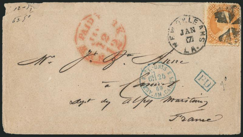 1572 c Image30c Orange, F. Grill (100). Clearly-defined grill at top, tied by circle of wedges and "New Orleans La. Jan. 7" circular datestamp on 1869 cover to Cannes, France, red "New York Paid 12 Jan. 12" credit datestamp, various French transits incl. blue boxed "PD", slight edgewear, Very Fine, carried aboard the Inman Line's Etna (Image)