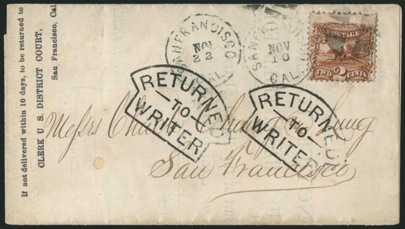 1575 c Image2c Brown (113). Centered to bottom, tied by quartered cork and by "San Francisco Cal. Nov. 10" circular datestamp on folded part-printed bankruptcy notice to local addressee, two bold strikes of "Returned to Writer" axe-style handstamp, also with Nov. 22 San Francisco circular datestamp, Fine, unusual, ex Lehman (Image)