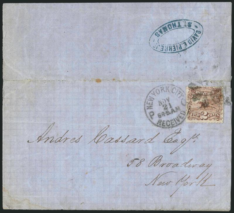 1576 c Image2c Brown (113). Tied by rosette and also by "New York City Received Nov. 21 6:45 AM" circular datestamp on blue folded letter from St. Thomas D.W.I. datelined "St. Thomas 13 Nov. 1869" to New York, bold strike of blue "David E. Pierre St. Thomas" forwarder's backstamp, carried on the North America which departed St. Thomas Nov. 14 and arrived in New York on Nov. 20 but carried outside of the mails, some splitting along folds and some wear, otherwise Very Fine, unusual use, entered the mails in New York where treated as a drop rate use, with 1996 P.F. certificate (Image)