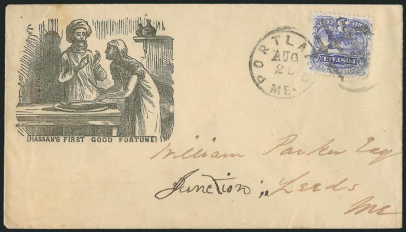 1577 c Image3c Ultramarine (114). Tied by pen cancels and "Portland Me. Aug. 20" circular datestamp on cover to Leeds Me., with illustrated scene "Hassan's First Good Fortune", ambiguous as to its meaning, but may refer to Hassan Sabbah, an 11th Century founder of an Islamic branch called Ismaelites, Very Fine, a very unusual cover (Image)