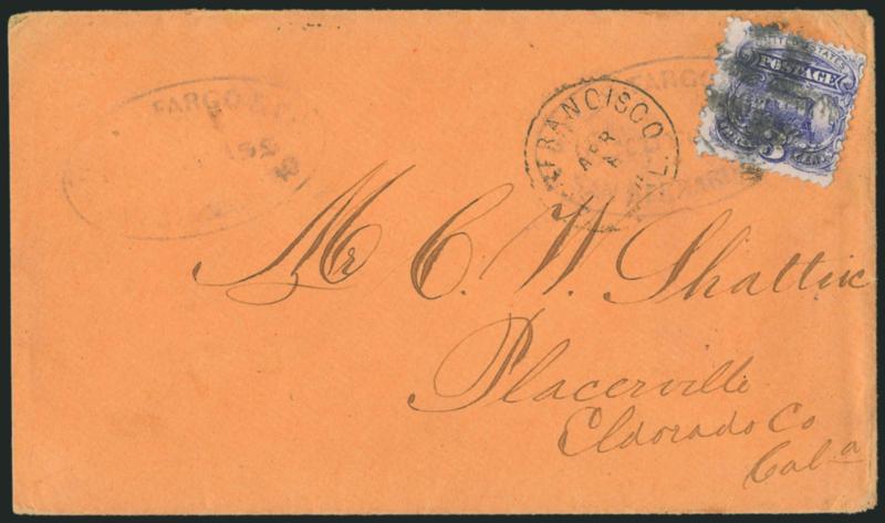 1578 c Image3c Ultramarine (114). Tied by segmented cork cancel, "San Francisco Cal. Apr. 8" circular datestamp, also tied by "Wells, Fargo & Co. Express, San Bernadino" oval handstamp struck twice on front and once on back of buff cover to Placerville Cal., Very Fine and extremely rare, carried by express from San Bernadino to San Francisco where it entered the mails to Placerville, the use of the 3c stamp instead of an embossed entire was illegal, with 1979 P.F. certificate (Image)