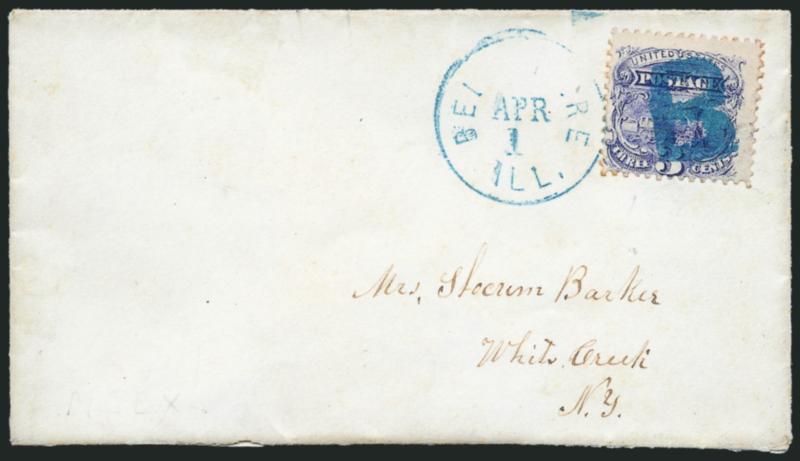 1579 c Image3c Ultramarine (114). Canceled by bold large blue "B" handstamp (Skinner-Eno LS-B11) and tied by matching "Belvidere Ill. Apr. 1" circular datestamp on small neat cover to White Creek N.Y., backflap tears and stamp with negligible perf toning, Extremely Fine strike of this fancy cancel, ex Foote and Wunsch (Image)