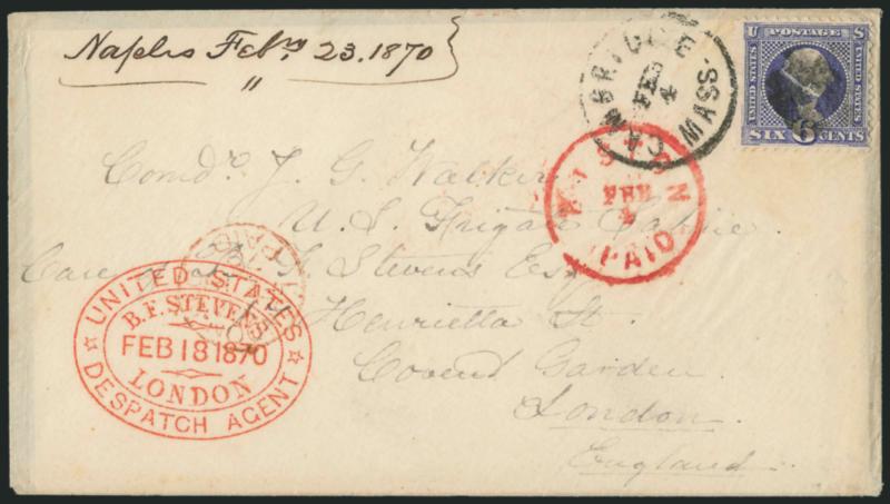 1581 c Image6c Ultramarine (115). Cancelled by cork with "Cambridge Mass. Feb. 4" circular datestamp on tissue-paper cover to Comm. Walker, U.S. Frigate Sabine, London, England, red "Boston Paid Feb. 4" transit, red "London Paid" transit, red "United States Despatch Agent, B.F. Stevens, London, Feb. 18, 1870" oval handstamp, receipt docketing "Naples Febry. 23, 1870" at upper left, stamp with tiny corner crease top left, still fresh and Very Fine (Image)