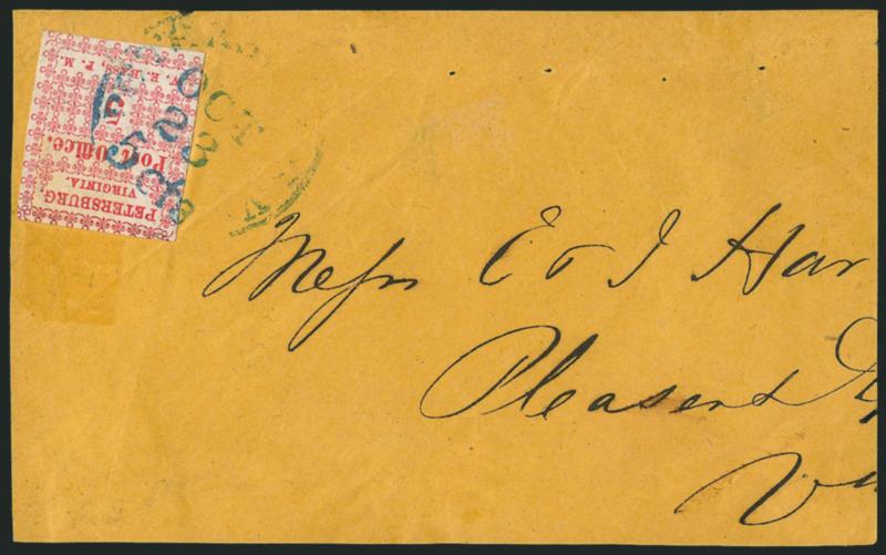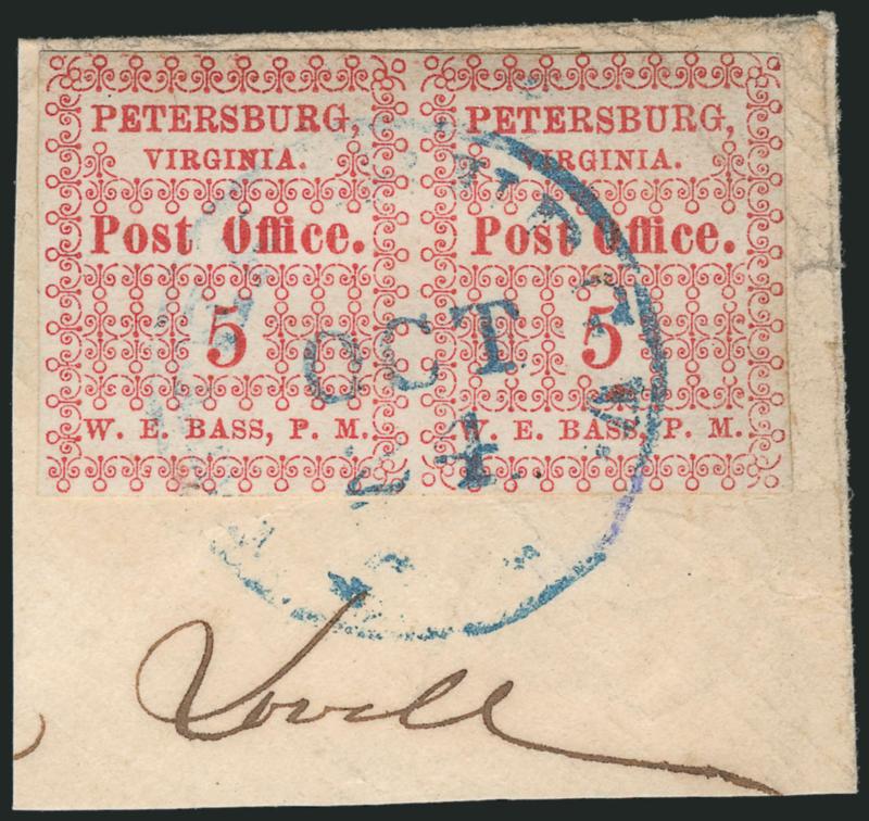 EXTREMELY FINE APPEARANCE. PAIRS OF THE PETERSBURG POSTMASTER'S PROVISIONAL ARE RARE. THIS IS THE FINEST OF THE THREE OFF-COVER PAIRS KNOWN TO US.