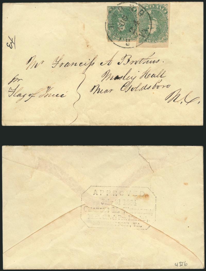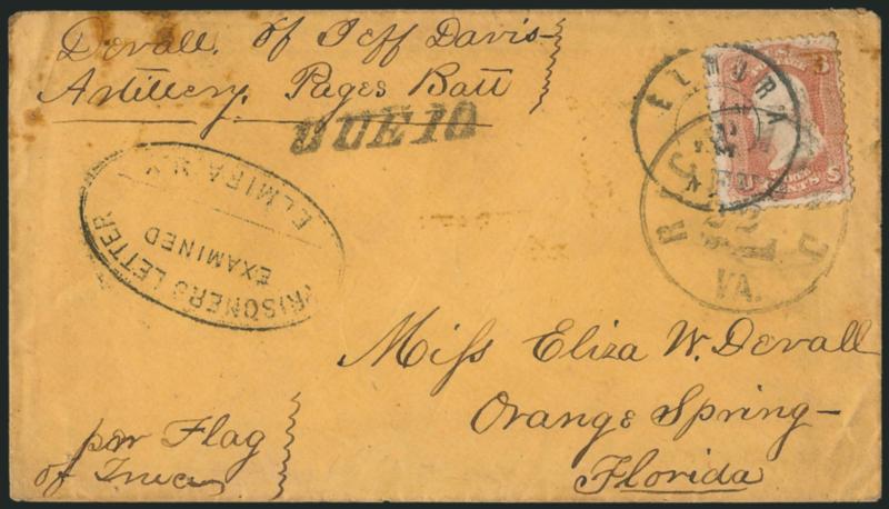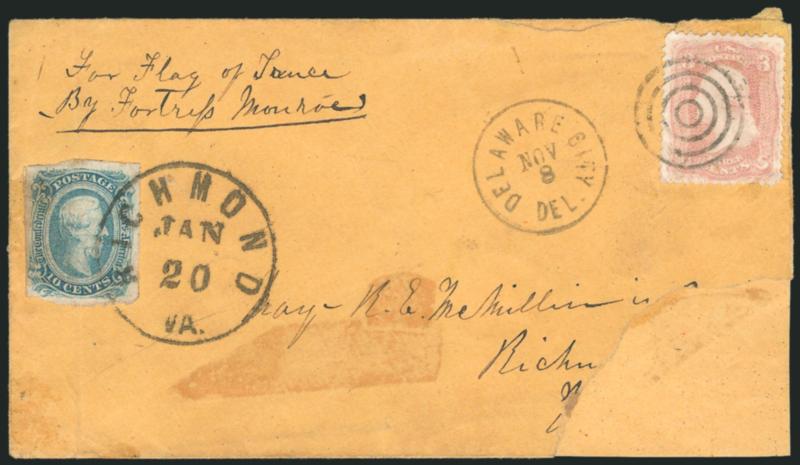 The use of Confederate stamps on a southbound flag-of-truce cover is very unusual, and this is a very late use of the 5c Green Lithograph. Typically, such covers show a due marking for C.S.A. postage (Image)