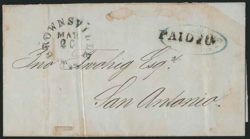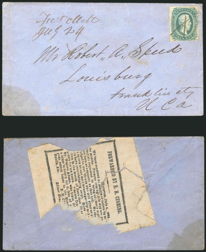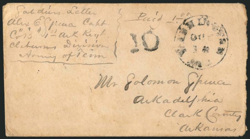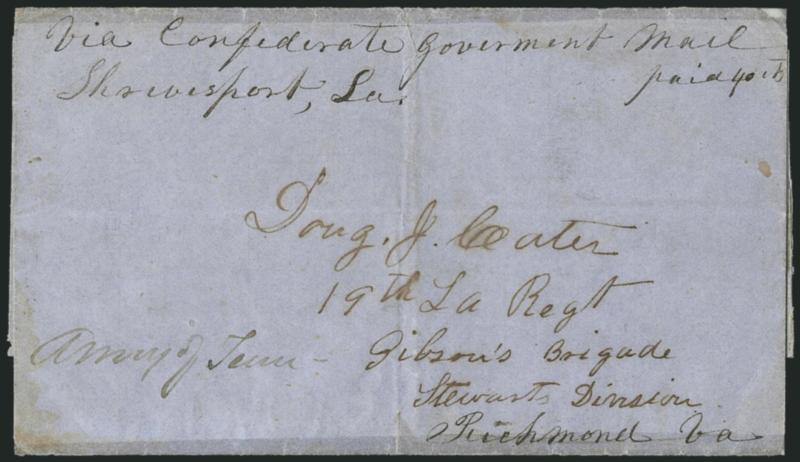 Douglas John Carter was enlisted with the 3rd Regiment Texas Cavalry in 1861 and transferred to the 19th Louisiana Infantry in June 1862. Carter served as its Chief Musician until the unit's surrender in May 1865. Carter's residence was in DeSoto Parish La., and this cover probably originated there in August 1864. Historical background is provided in "An Unusual Trans-Mississippi Express Mail Cover" by Brian and Patricia Green, Confederate Philatelist, May-June 1973.